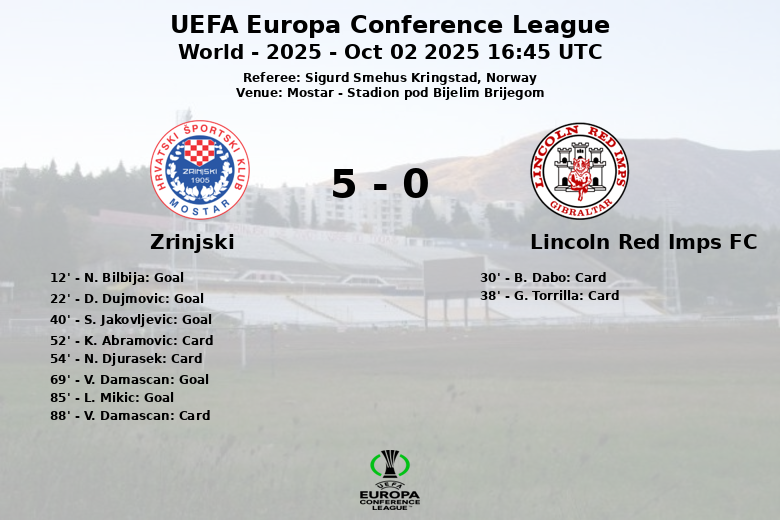 Mostar, Bosnia and Herzegovina – Zrinjski displayed their superiority at Stadion pod Bijelim Brijegom, overcoming Lincoln Red Imps FC in a match corresponding to the UEFA Europa Conference League. The home team dominated possession with 51% and translated their dominance onto the scoreboard with a resounding victory.