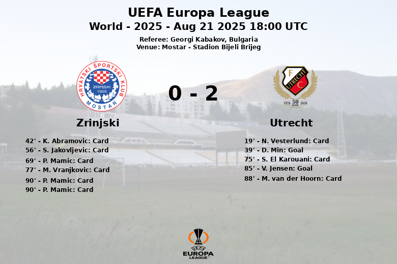 Mostar, August 21, 2025 – Utrecht secured a valuable away victory against Zrinjski Mostar at Stadion Bijeli Brijeg in the first leg of the UEFA Europa League play-offs. The match, officiated by Bulgarian referee Georgi Kabakov, was marked by intensity and numerous cautions, culminating in a red card for Zrinjski in stoppage time.