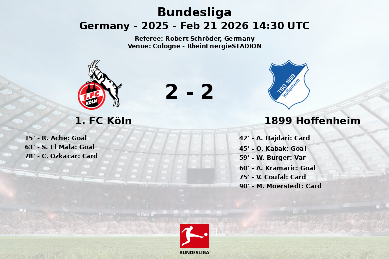 Apesar do domínio do Hoffenheim na posse de bola (64% contra 36% do Köln) e um maior número de chutes (18 contra 9), o Köln conseguiu manter a paridade no placar. O Hoffenheim teve mais chutes a gol (6 contra 4) e escanteios (10 contra 3), mas não foi suficiente para levar a vitória. O árbitro Robert Schröder mostrou vários cartões amarelos, incluindo um para C. Ozkacar do Köln e para A. Hajdari e V. Coufal do Hoffenheim. A partida terminou com um empate que deixou um sabor agridoce para ambas as equipes.