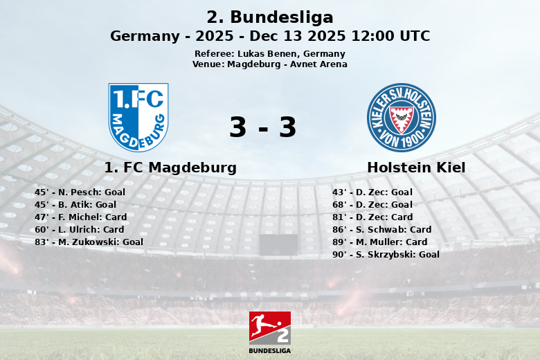 Magdeburg, Alemanha – Uma partida cheia de reviravoltas aconteceu na Avnet Arena, onde o 1. FC Magdeburg e o Holstein Kiel empataram em um jogo da 2. Bundesliga. A partida, apitada por Lukas Benen, terminou com um placar que reflete a intensidade do jogo.