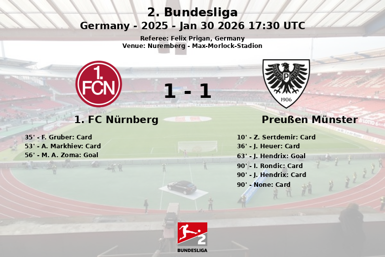 Nuremberg, Alemanha – Uma partida disputada e repleta de cartões amarelos no Max-Morlock-Stadion viu o 1. FC Nürnberg e o Preußen Münster empatarem em um jogo correspondente à 20ª rodada da 2. Bundesliga. A partida, arbitrada por Felix Prigan, foi caracterizada pela intensidade no meio-campo e constantes interrupções.