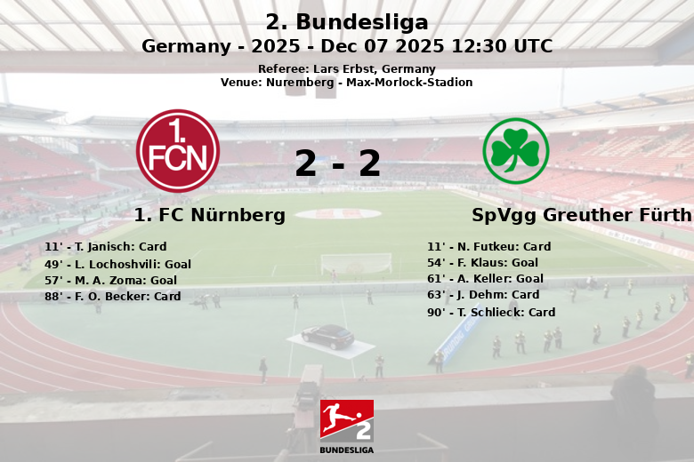 L. Lochoshvili abriu o placar para o Nürnberg aos 49 minutos, com assistência de J. Justvan. No entanto, a alegria dos mandantes durou pouco, já que F. Klaus empatou para o Fürth aos 54 minutos. Três minutos depois, M. A. Zoma colocou o Nürnberg novamente à frente graças a um passe de A. Markhiev. O Fürth demonstrou seu espírito de luta e A. Keller empatou novamente aos 61 minutos, assistido por N. Futkeu.