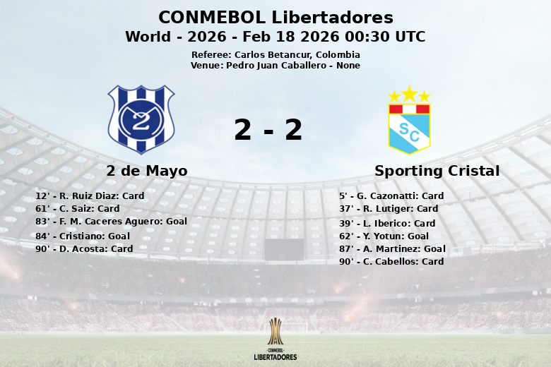 Pedro Juan Caballero foi palco de um jogo vibrante entre 2 de Mayo e Sporting Cristal, válido pela CONMEBOL Libertadores. A partida, apitada pelo colombiano Carlos Betancur, terminou em um empate de 2 a 2.