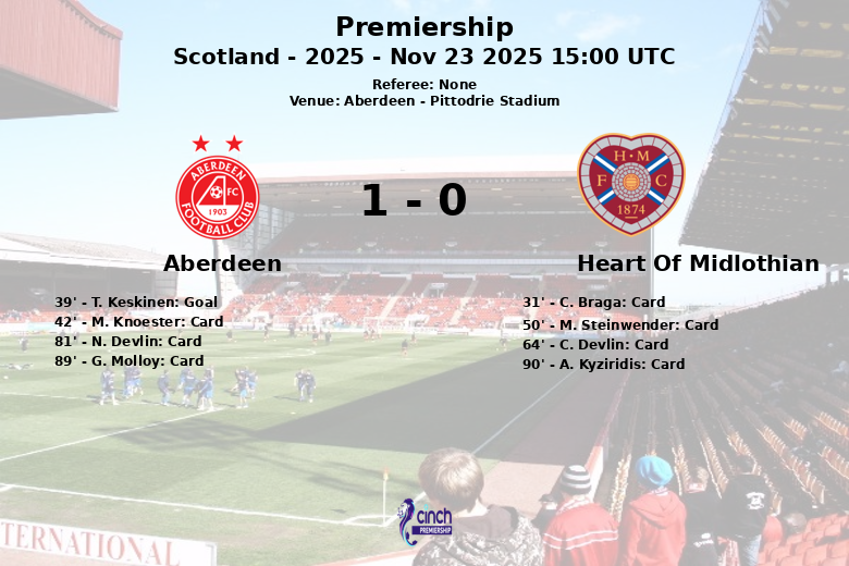 Aberdeen, Escócia – Em uma partida carregada de intensidade e cartões, o Aberdeen venceu o Heart Of Midlothian no Pittodrie Stadium. O único gol do jogo, marcado por T. Keskinen aos 39 minutos, garantiu a vitória para o time da casa.