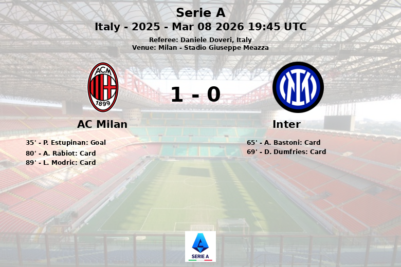 Milão, Itália – Em um clássico vibrante disputado no Stadio Giuseppe Meazza, o AC Milan derrotou a Inter em um jogo marcado por intensidade e jogo tático. O único gol da partida ocorreu aos 35 minutos, quando P. Estupinan, assistido por Y. Fofana, furou a meta da Inter com um chute preciso.