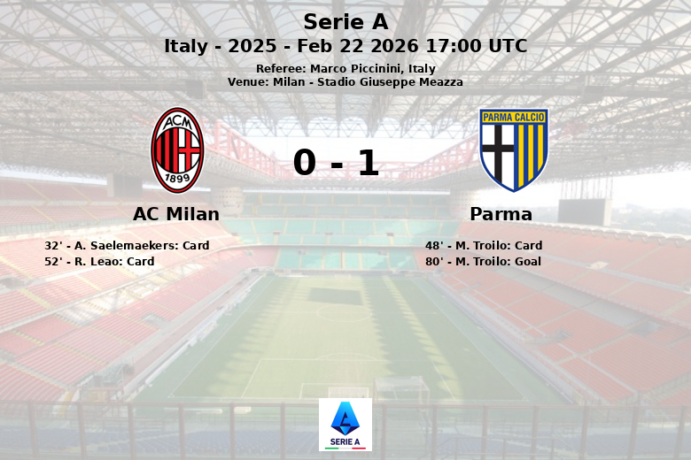 O momento decisivo ocorreu aos 80 minutos, quando M. Troilo, assistido por E. Valeri, marcou para o Parma, silenciando momentaneamente o estádio. Este gol se mostrou crucial, pois o Milan, apesar de seus esforços tardios, não conseguiu reverter o placar. A partida, arbitrada por Marco Piccinini, terminou com uma vitória fora de casa que complica as aspirações do Milan na Serie A.