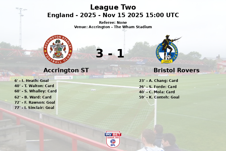 No entanto, o Accrington não vacilou. F. Rawson marcou aos 72 minutos, seguido por I. Sinclair aos 77 minutos, selando a vitória para a equipe da casa. Embora o Bristol Rovers tenha tido mais chutes totais (10 em comparação com os 9 do Accrington), a precisão do Accrington provou ser decisiva, com 5 chutes no alvo em comparação com apenas 2 de seus rivais. A partida terminou com uma clara vitória para o Accrington Stanley, refletindo sua eficácia e capacidade de capitalizar as oportunidades em casa.