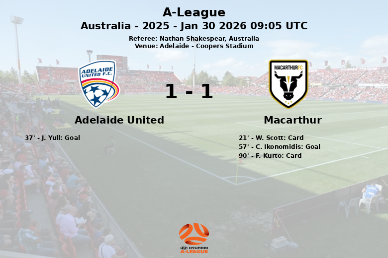Adelaide, Austrália – Num jogo disputado no Coopers Stadium, em Adelaide, o Adelaide United e o Macarthur empataram num encontro correspondente à jornada 15 da A-League. O jogo, arbitrado por Nathan Shakespear, foi caracterizado pela elevada posse de bola da equipa da casa (59%), que tentou impor o seu jogo ao longo da partida.