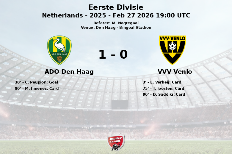 Haia, Holanda – O ADO Den Haag venceu o VVV Venlo em uma partida disputada no Bingoal Stadion, onde a superioridade da equipe da casa foi evidente desde o início. Apesar de um cartão amarelo precoce para o jogador do VVV Venlo, L. Verheij, aos 3 minutos, o ADO Den Haag manteve a calma e continuou pressionando. A recompensa veio aos 30 minutos com um gol de C. Peupion, sem assistência aparente.