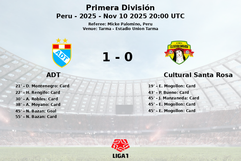 Tarma foi palco de um jogo tenso e cheio de cartões entre ADT e Cultural Santa Rosa, correspondente à 18ª jornada do Clausura da Primera División peruana. O ADT saiu vitorioso no Estádio Unión Tarma, num jogo dominado por faltas e advertências do árbitro Micke Palomino.