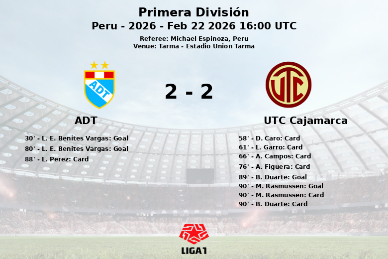 No segundo tempo, Benites Vargas ampliou a vantagem para o ADT aos 80 minutos, com assistência de C. Cabello. No entanto, UTC Cajamarca reagiu fortemente nos minutos finais. B. Duarte descontou aos 89 minutos, com assistência de M. Rasmussen, e M. Rasmussen empatou a partida nos acréscimos, deixando o placar final em 2-2.