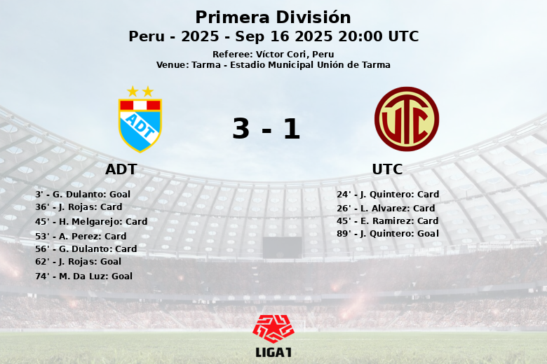 Tarma, Peru – Em um vibrante encontro disputado no Estádio Municipal Unión de Tarma, o ADT conquistou uma contundente vitória sobre o UTC, em partida válida pela nona rodada do Apertura da Primeira Divisão Peruana.