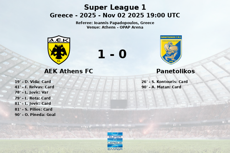 A partida foi intensa, com um total de 7 cartões amarelos mostrados, 5 para o AEK Atenas e 2 para o Panetolikos. Um gol de Jovic para o AEK foi anulado pelo VAR devido a uma falta anterior. Finalmente, no último minuto do tempo regulamentar, Pineda quebrou o empate com um gol que gerou euforia entre os torcedores da casa.