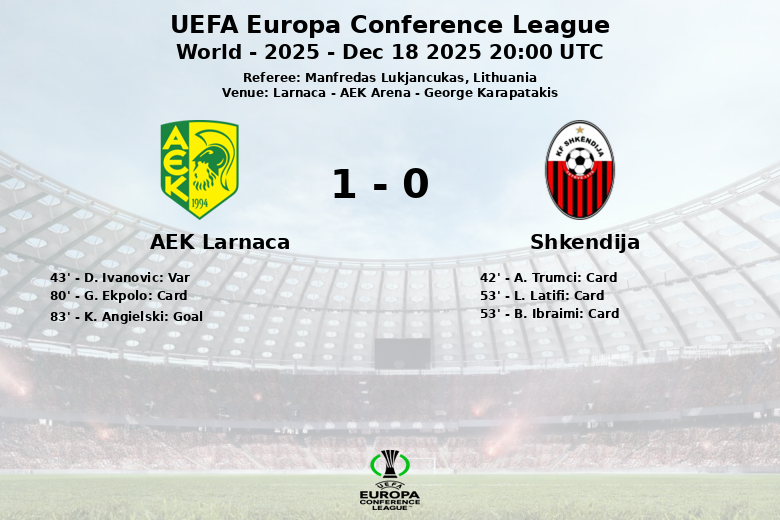 Larnaca, 18 de dezembro de 2025 – O AEK Larnaca derrotou o Shkendija em uma partida da UEFA Europa Conference League realizada no AEK Arena – George Karapatakis. A partida, apitada pelo lituano Manfredas Lukjancukas, foi caracterizada por um domínio avassalador do AEK Larnaca, refletido em sua posse de bola de 71%.