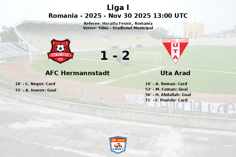 Sibiu, Romênia – Em uma partida disputada no Stadionul Municipal, o Uta Arad saiu vitorioso contra o AFC Hermannstadt em um jogo marcado por intensidade e eventos importantes. A partida, válida pela 18ª rodada da temporada regular da Liga I, viu o Uta Arad impor seu jogo e capitalizar na expulsão precoce de um jogador do AFC Hermannstadt aos 18 minutos, devido a um cartão vermelho.