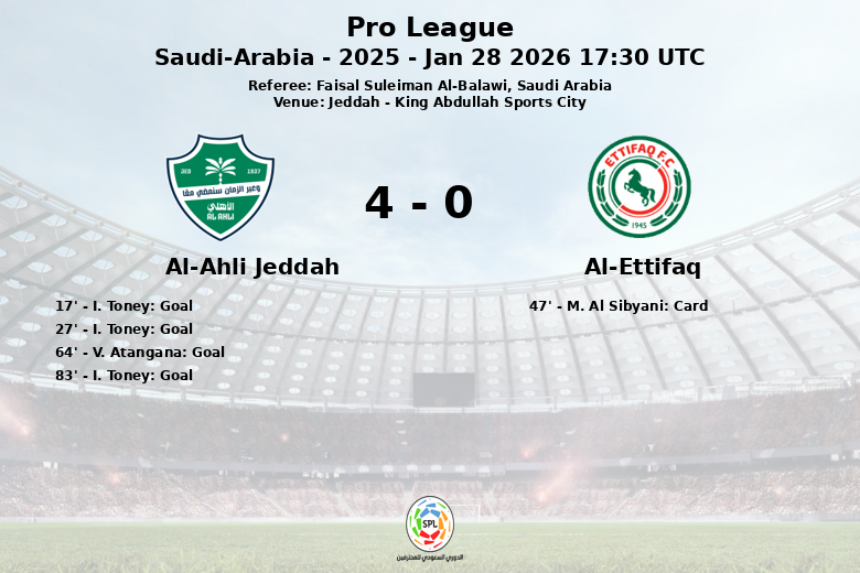 O destaque da partida foi I. Toney, que abriu o placar aos 17 minutos com um belo gol após assistência de R. Mahrez. Toney ampliou a vantagem do Al-Ahli ao converter um pênalti aos 27 minutos. No segundo tempo, V. Atangana fez 3 a 0 aos 64 minutos com um gol assistido por I. Toney, consolidando o domínio da equipe da casa. I. Toney coroou sua atuação marcante ao converter outro pênalti aos 83 minutos, selando o placar final de 4 a 0.