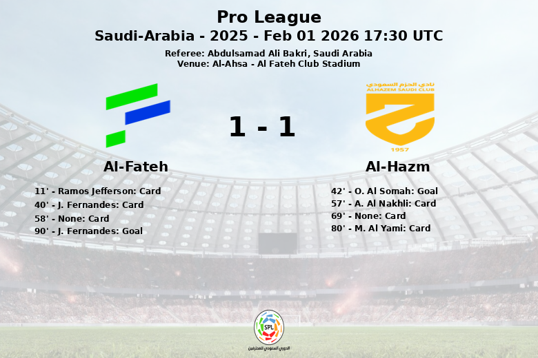 Al-Fateh e Al-Hazm protagonizaram um encontro disputado em Al-Ahsa que terminou com um empate de 1-1. A partida, correspondente à 20ª jornada da Pro League saudita, foi marcada pela intensidade e o alto número de faltas cometidas por ambas as equipes.