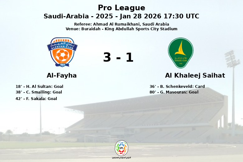 Buraidah, 28 de janeiro de 2026 – O Al-Fayha conquistou uma importante vitória sobre o Al Khaleej Saihat no King Abdullah Sports City Stadium, em partida válida pela 19ª rodada da Pro League Saudita. O placar final refletiu um domínio tático do Al-Fayha, apesar do Al Khaleej Saihat ter desfrutado de maior posse de bola.