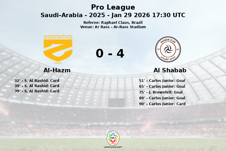 Ar Rass, Arábia Saudita – Em partida realizada no Ar-Rass Stadium sob o olhar atento do árbitro Raphael Claus, o Al Shabab derrotou o Al-Hazm de forma contundente na 19ª rodada da Pro League. O confronto, marcado por uma clara superioridade na posse de bola (55% para o Al Shabab contra 45% do Al-Hazm) e um domínio ofensivo avassalador, culminou em uma vitória folgada para a equipe visitante.