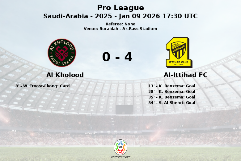 Buraidah, Arábia Saudita – Em uma partida disputada no Estádio Ar-Rass, o Al-Ittihad FC dominou amplamente o Al Kholood, garantindo uma vitória retumbante na Pro League. O jogo, válido pela 14ª rodada da temporada de 2025, foi marcado desde o início pela expulsão de W. Troost-Ekong do Al Kholood aos 8 minutos.