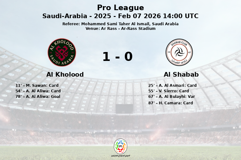 Um golo de A. Al Bulayhi, do Al Shabab, foi anulado pelo VAR aos 67 minutos. O momento decisivo aconteceu aos 78 minutos, quando A. Al Aliwa marcou para o Al Kholood, dando-lhes a vantagem que manteriam até ao final da partida. O Al Shabab, apesar de uma investida tardia, não conseguiu empatar. H. Camara, do Al Shabab, também foi advertido aos 87 minutos. O Al Kholood, com 6 remates (2 à baliza e 2 para fora) e 5 cantos, soube defender a sua vantagem e garantir os três pontos em casa.