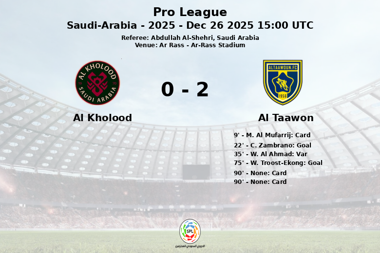 O final da partida foi caótico. O Al Taawon recebeu dois cartões amarelos e um cartão vermelho nos acréscimos, refletindo a tensão acumulada. Apesar de estar com um jogador a menos, o Al Taawon conseguiu manter a vantagem e garantir os três pontos. O Al Kholood, apesar de seu domínio na posse de bola e chutes, não conseguiu capitalizar suas oportunidades e saiu de mãos vazias.