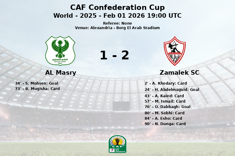 Alexandria, Egito – Em um jogo disputado no Estádio Borg El Arab, o Zamalek SC derrotou o AL Masry em um confronto da Taça da Confederação CAF. A partida, caracterizada por um alto número de faltas e cartões amarelos, terminou com um placar favorável à equipe branca.