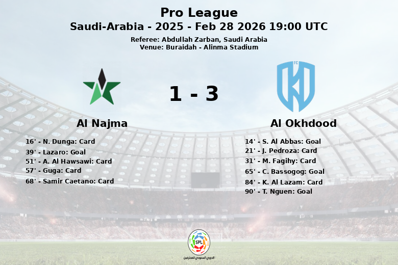 Buraidah testemunhou um jogo tenso e emocionante entre Al Najma e Al Okhdood, válido pela 24ª rodada da Pro League. Apesar do domínio na posse de bola por parte do Al Najma (64%), o Al Okhdood conseguiu garantir a vitória com um placar final de 3-1.