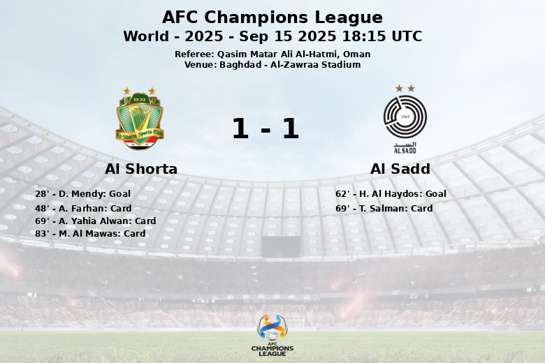 A partida foi caracterizada por um jogo disputado, refletido nas nove faltas cometidas pelo Al Shorta e nas treze do Al Sadd. O árbitro mostrou quatro cartões amarelos, três para o Al Shorta (A. Farhan, A. Yahia Alwan e M. Al Mawas) e um para o Al Sadd (T. Salman). Apesar do domínio na posse de bola e um maior número de escanteios (5 contra 1), o Al Shorta não conseguiu capitalizar suas oportunidades, enquanto o Al Sadd, com menos posse, aproveitou uma de suas poucas chegadas para levar um ponto de Bagdad. No final, um empate que deixa ambas as equipes com a necessidade de somar pontos nas próximas partidas para avançar na competição.