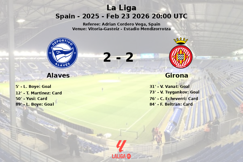 VITORIA-GASTEIZ – Uma partida vibrante no Estádio Mendizorrotza terminou em empate entre Alavés e Girona. O Alavés abriu o placar cedo, com um gol de L. Boye aos 5 minutos, assistido por Yusi. No entanto, o Girona respondeu aos 31 minutos com um gol de V. Vanat, após assistência de A. Witsel, empatando o marcador antes do intervalo. O jogo também foi marcado pela intensidade, com cartões amarelos mostrados a T. Martinez e Yusi pelo Alavés e a C. Echeverri e F. Beltran pelo Girona. No segundo tempo, o Girona assumiu a liderança com um gol de V. Tsygankov aos 73 minutos, assistido por A. Ounahi. Quando parecia que o Girona levaria a vitória, L. Boye reapareceu pelo Alavés aos 89 minutos, assistido por V. Parada, selando o empate final. O Alavés dominou a posse de bola com 45%, tentando 17 chutes, enquanto o Girona teve 55% de posse de bola, chutando em 10 oportunidades. A arbitragem ficou a cargo de Adrian Cordero Vega.