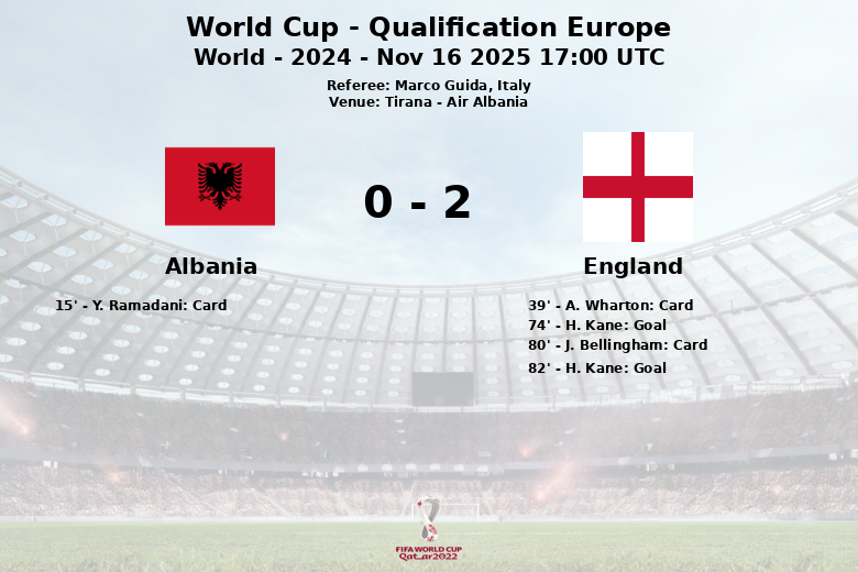 O placar foi aberto aos 74 minutos com um gol de Harry Kane. Kane então adicionou um segundo gol aos 82 minutos, selando a vitória inglesa. O árbitro italiano Marco Guida distribuiu um cartão amarelo para Y. Ramadani da Albânia aos 15 minutos, e para A. Wharton aos 39 e J. Bellingham aos 80 pela Inglaterra. Apesar dos esforços da Albânia, a posse de bola superior da Inglaterra e a eficácia de Kane provaram ser decisivas para determinar o resultado final.