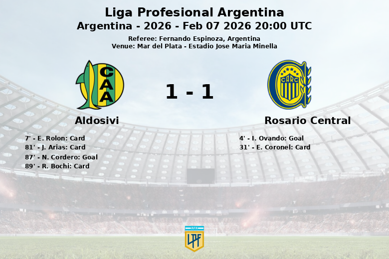 Mar del Plata foi palco de um jogo disputado entre Aldosivi e Rosario Central, que terminou empatado em 1 a 1. A partida, válida pela quarta rodada da Liga Profesional Argentina, aconteceu no Estádio José María Minella, com Fernando Espinoza como árbitro.