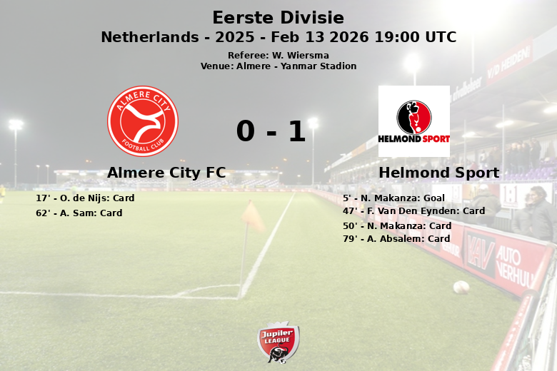 Almere, Países Baixos – Em uma partida disputada no Yanmar Stadion, o Helmond Sport surpreendeu ao vencer o Almere City FC. Apesar de dominar a posse de bola com 70%, o Almere City FC não conseguiu capitalizar sua vantagem. O Helmond Sport, por sua vez, aproveitou uma de suas poucas oportunidades para marcar um gol logo aos 5 minutos, graças a N. Makanza.