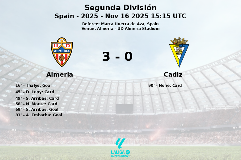 Almería, Espanha – Em uma partida realizada no UD Almería Stadium, o Almería derrotou o Cádiz de forma convincente, exibindo notável superioridade na posse de bola (58%) e um ataque eficaz. O placar final refletiu o domínio da equipe da casa, com gols de Thalys aos 16 minutos, após uma jogada bem construída, e posteriormente ampliado por S. Arribas de pênalti aos 69 minutos. A. Embarba selou a vitória com um gol aos 81 minutos.