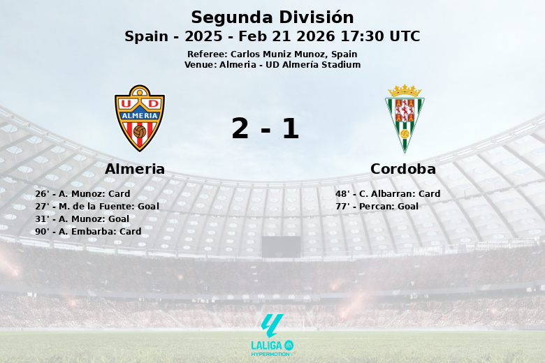 Almeria vs Cordoba Feb 21 2026 17:30 UTC