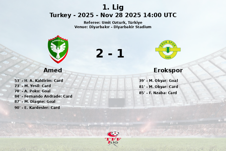 Diyarbakır, Turquia – Em uma partida disputada no Diyarbakir Stadium, o Amed conseguiu superar o Erokspor com um placar de 2-1, em um jogo correspondente à 15ª rodada da 1. Lig turca.