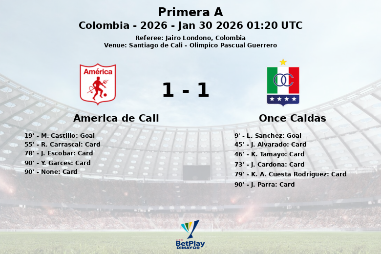 Santiago de Cali foi palco de um encontro disputado entre América de Cali e Once Caldas, que culminou em um empate em um gol. A partida, válida pela terceira rodada da Primera A, foi caracterizada pela intensidade e fricção no meio-campo, refletida na quantidade de advertências mostradas pelo árbitro Jairo Londoño.
