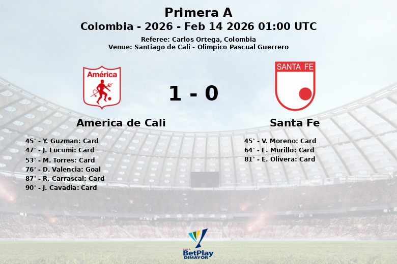 Santiago de Cali, Colômbia – Em partida correspondente à sexta rodada da Primera A, o América de Cali prevaleceu sobre o Santa Fe no Estádio Olímpico Pascual Guerrero. O jogo, apitado por Carlos Ortega, foi tenso e marcado por cartões amarelos, com quatro para o América e três para o Santa Fe.