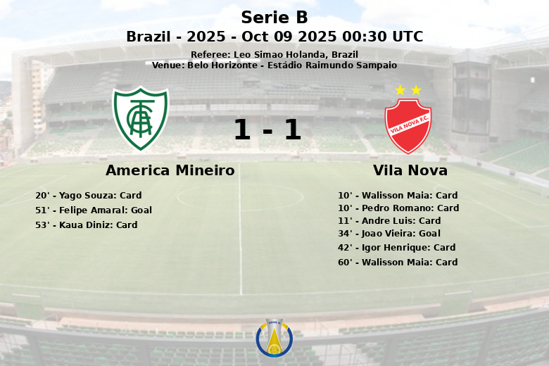 Belo Horizonte foi palco de um encontro disputado entre América Mineiro e Vila Nova, que culminou em um empate de 1 a 1. A partida, realizada no Estádio Raimundo Sampaio, foi marcada pela intensidade e disciplina, refletida na quantidade de cartões mostrados pelo árbitro Leo Simão Holanda.