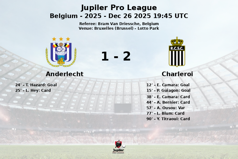 O Anderlecht conseguiu diminuir o prejuízo graças a um pênalti convertido por T. Hazard aos 24 minutos. Apesar de dominar a posse de bola com 62% e gerar mais oportunidades de gol (17 chutes no total contra 13 do Charleroi), o Anderlecht não conseguiu empatar o marcador. A defesa do Charleroi se manteve firme, embora tenha cometido mais faltas (16 contra 7 do Anderlecht) e recebido mais cartões amarelos (4 contra 1). Um gol de A. Ousou para o Charleroi foi anulado pelo VAR por impedimento aos 57 minutos. A partida foi arbitrada por Bram Van Driessche.