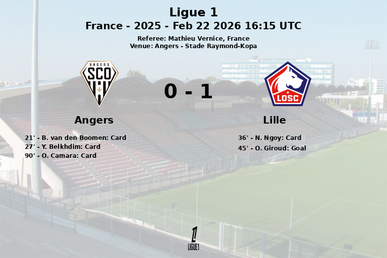Angers, França – Num jogo disputado no Stade Raymond-Kopa, o Lille superou o Angers por uma margem mínima, cortesia de um gol de pênalti de Olivier Giroud, pouco antes do intervalo. A partida, parte da 23ª jornada da Ligue 1, foi arbitrada pelo árbitro francês Mathieu Vernice.