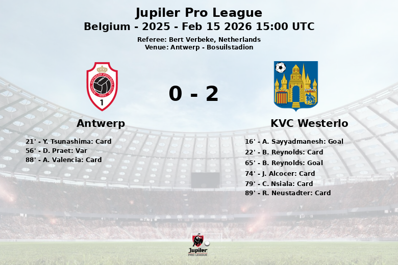 A polêmica surgiu aos 56 minutos, quando um gol de D. Praet para o Antwerp foi anulado por impedimento após revisão do VAR. Este incidente pareceu desmoralizar a equipe da casa, enquanto o Westerlo aproveitou o momento para ampliar sua vantagem. B. Reynolds marcou o segundo gol para o Westerlo aos 65 minutos, com assistência de A. Sayyadmanesh, solidificando a vitória dos visitantes.