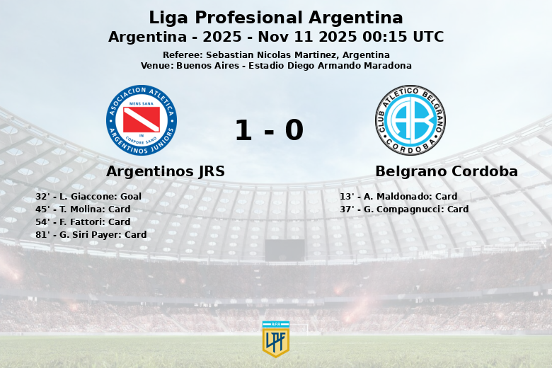 Apesar de ter menos posse de bola (45%), o Belgrano tentou gerar perigo com 13 chutes, embora apenas 2 tenham sido no alvo. O Argentinos Juniors, por sua vez, chutou 15 vezes, com 4 chutes diretos ao gol. A arbitragem de Sebastián Nicolás Martínez foi intensa, mostrando cartões amarelos para A. Maldonado e G. Compagnucci pelo Belgrano, e para T. Molina, F. Fattori e G. Siri Payer pelo Argentinos Juniors. No geral, uma partida onde o Argentinos Jrs. soube manter a vantagem e conquistar os três pontos.