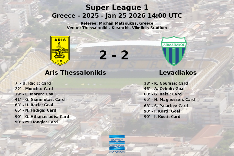 Salónica, Grécia – O estádio Kleanthis Vikelidis foi palco de um vibrante jogo da Super League 1 entre o Aris Salónica e o Levadiakos. O encontro, apitado por Michail Matsoukas, terminou com um resultado favorável à equipa da casa, ainda que não sem sofrimento.