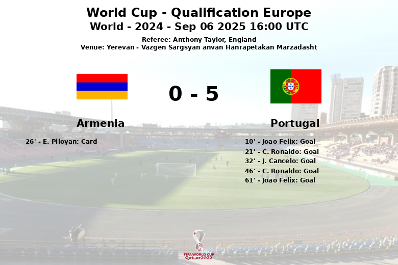 Ronaldo marcou novamente no início do segundo tempo, reafirmando o domínio português. João Félix garantiu seu bis aos 61 minutos. A Armênia, apesar dos seus esforços, não conseguiu contrariar a ofensiva portuguesa. Com apenas 29% de posse de bola e 7 remates (3 à baliza), a equipa da casa foi superada em todas as facetas do jogo. E. Piloyan recebeu um cartão amarelo aos 26 minutos. O árbitro inglês Anthony Taylor supervisionou a partida.