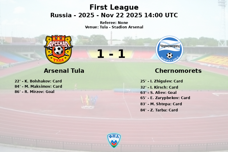 Tula, Rússia – Em uma partida tensa e com muitos cartões, Arsenal Tula e Chernomorets empataram em 1 a 1 no Stadion Arsenal. O jogo, válido pela 20ª rodada da First League, foi marcado por um jogo físico e disputado.