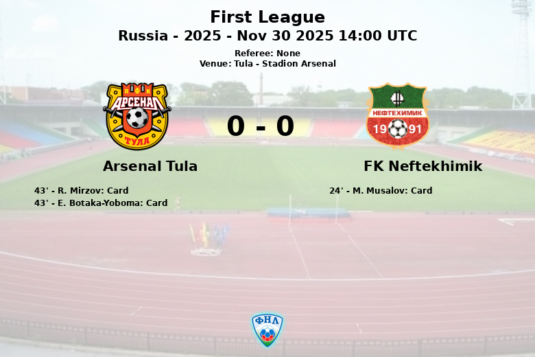 Tula, Rússia – Uma partida da First League entre Arsenal Tula e FK Neftekhimik terminou em um empate de 0 a 0 em 30 de novembro de 2025, no Stadion Arsenal. A partida, parte da temporada regular – 21, foi marcada pela intensidade e falta de oportunidades claras de gol para ambas as equipes.
