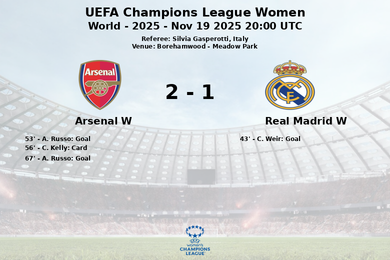 Borehamwood, Inglaterra – Em um emocionante confronto disputado no Meadow Park, o Arsenal Feminino conquistou uma importante vitória sobre o Real Madrid Feminino na 4ª jornada da fase de grupos da UEFA Champions League Feminina. A partida, arbitrada pela italiana Silvia Gasperotti, viu o Real Madrid abrir o placar aos 43 minutos com um gol de C. Weir.