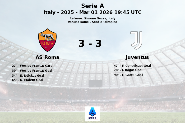 O time da casa voltou a ficar à frente no placar graças a um gol de E. Ndicka aos 54 minutos, com assistência de L. Pellegrini, mas a Juventus não se rendeu. D. Malen marcou para a Roma aos 65 minutos, com assistência de M. Kone. J. Boga empatou para 3-3 aos 78 minutos. Finalmente, aos 90 minutos, F. Gatti marcou o gol do empate definitivo para a Juventus, frustrando as aspirações de vitória da Roma.