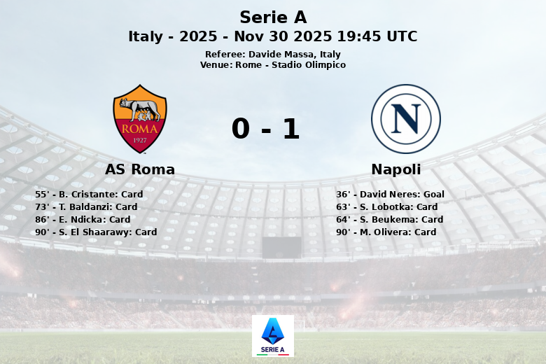 Apesar dos esforços da Roma para empatar, o Napoli conseguiu defender sua vantagem e conquistou os três pontos em um jogo chave para suas aspirações na liga. O árbitro Davide Massa teve uma noite movimentada, marcando inúmeras faltas e advertindo vários jogadores de ambas as equipes. M. Olivera, do Napoli, recebeu um cartão amarelo aos 90 minutos.